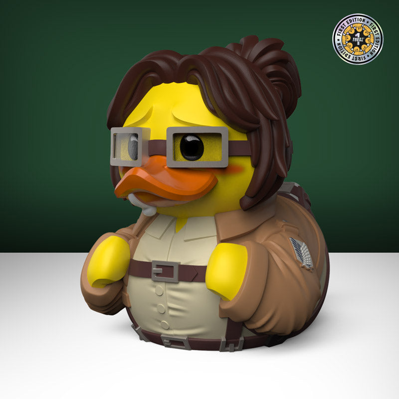 Plongez dans le merveilleux chaos du monde de Hange Zoë avec ce TUBBZ Première Édition ! Chercheur excentrique sur les Titans du Régiment Scout, Hansi apporte un mélange unique d'intelligence et d'enthousiasme, désormais avec des plumes ! Vêtu de son uniforme emblématique et de lunettes parfaitement perchées sur son bec, ce canard de Hansi capture son esprit curieux et énergique.