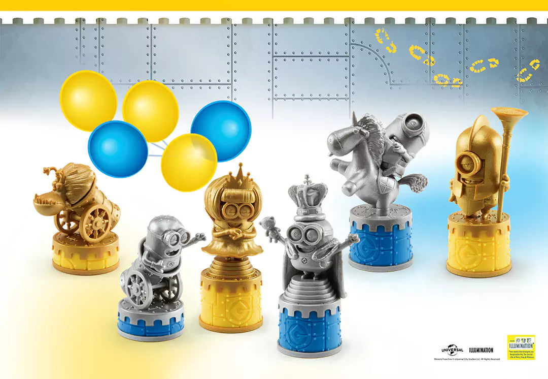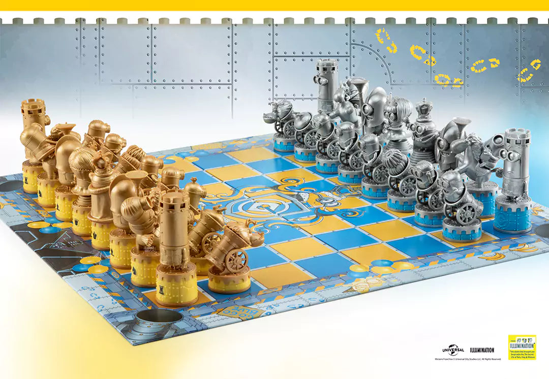 Échiquier Minions - La pagaille Médiévale, composé de 32 pièces en plastique et d'un plateau en carton rigide.
