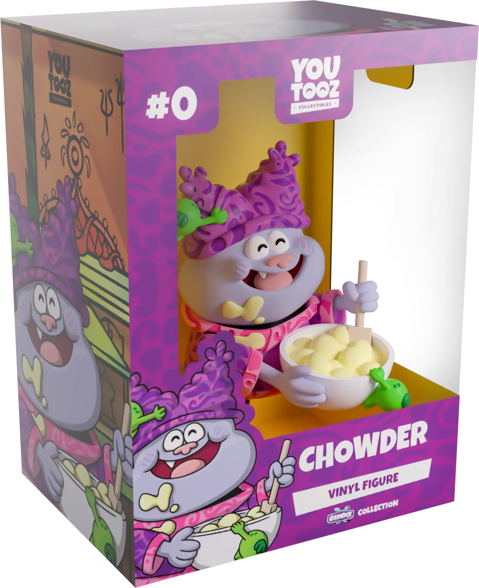 Il est peut-être encore en apprentissage, mais Chowder est prêt à servir quelque chose de délicieux alors qu'il saute directement de l'écran vers Youtooz pour ses débuts ! Debout avec bonheur à 10 cm de hauteur et tenant joyeusement un grand bol dans une main et une cuillère en bois dans l'autre pendant qu'il remue la délicieuse nourriture à l'intérieur, accrochés au bord du bol et à la pointe de son chapeau se trouvent deux petits amis verts ronds. Vêtus d'une tenue rose et violette éblouissante recouverte de motifs ornés et complexes, un chapeau à double pointe couvre ses oreilles tandis qu'une queue bleue sort de derrière. La boîte de présentation vitrée a été illustrée pour présenter une scène de l'intérieur de la cuisine du chef Daal avec un bol de fruits au premier plan, tandis que l'intérieur de la boîte est d'un ton jaune chaud. La pochette de protection est alors un gros plan vibrant de la cuisine d'un point de vue différent car leur silhouette peut être vue à travers la grande fenêtre transparente à l'avant. Cet objet de collection a été conçu en collaboration avec le membre de la communauté @therealracckun et est livré dans une pochette extérieure mate, gaufrée et protectrice et un protecteur en plastique de taille personnalisée pour une protection maximale pendant l'expédition.