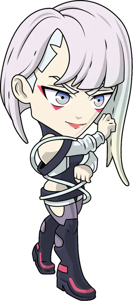 Qu'est-ce que c'est, Youtooz est piraté !? Ce ne pouvait être que Lucy travaillant sur ses débuts ! Debout à 3,9 pouces de hauteur et fouettant Monowire autour de son corps, elle tient deux mains serrées levées à l'avant se préparant à pirater ou à attaquer ! Son visage mortel est mis en valeur avec du rouge à lèvres rose et du maquillage sur des yeux anguleux déterminés, tandis qu'un bob élégant passe du rose pastel au jaune pour encadrer son visage avec une frange droite et deux longues extrémités descendant de chaque côté. Une veste blanche et grise se trouve autour de ses épaules et au-dessus d'un ensemble sombre sans manches et sans jambes avec un col haut, sa tenue est complète avec une ceinture épaisse sur un short blanc taille basse qui se retrouve avec des bas gris et des bottes hautes avec une bordure rose. L'extérieur de son emballage la voit, elle et David, regarder vers l'extérieur vers l'énorme lune brillante dans le ciel nocturne. Alors que l'intérieur est d'un blanc éclatant avec un motif cyber rose pâle et le logo Edgrerunners. La pochette de protection montre Lucy et David assis au sommet d'un bâtiment avec l'horizon néon de Night City au loin.