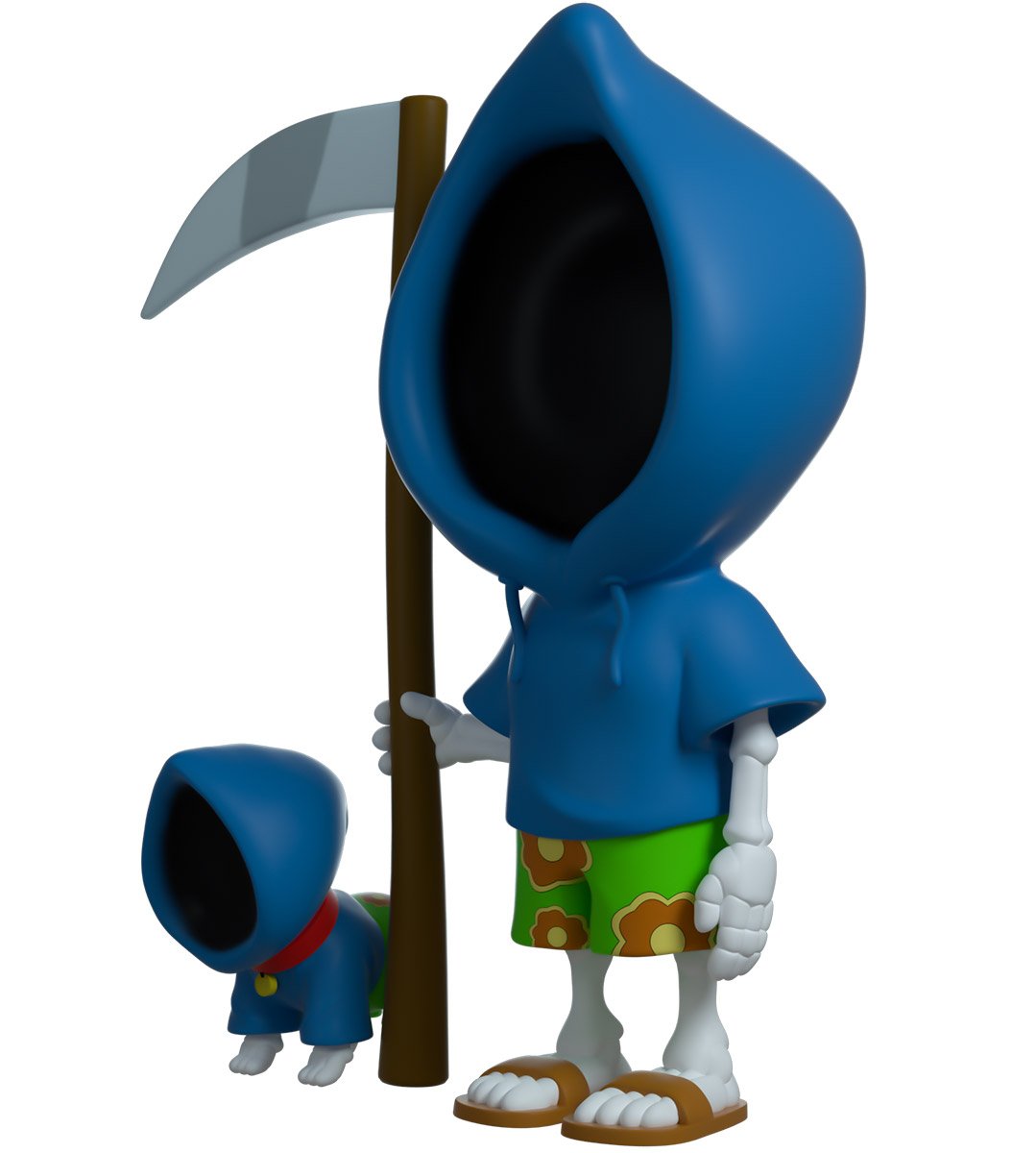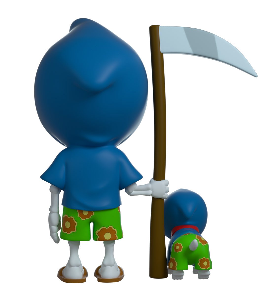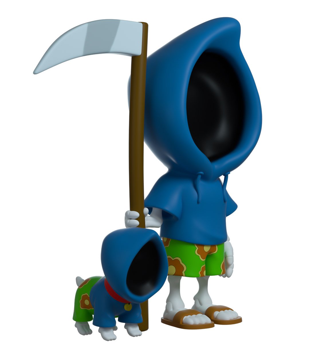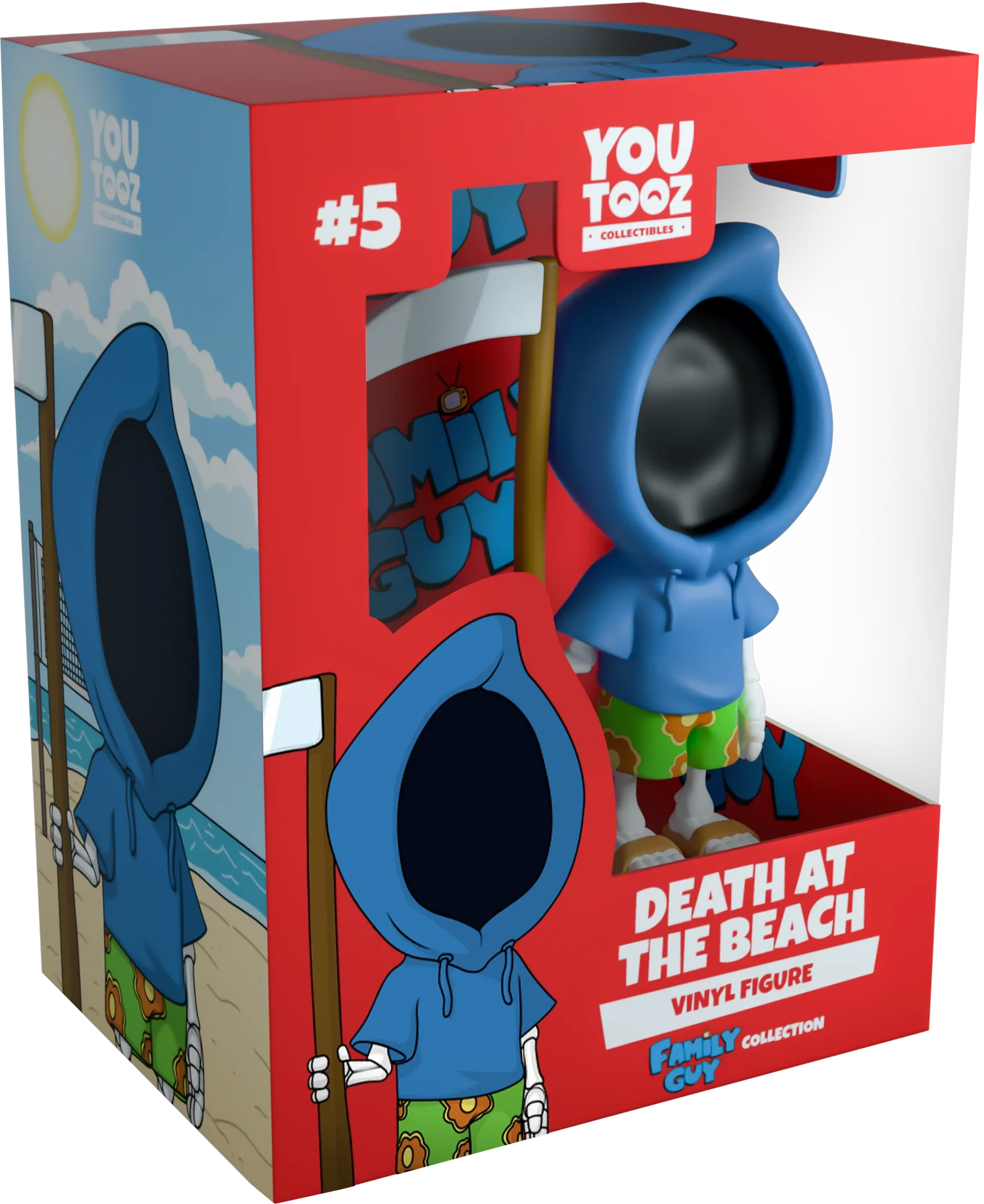 La Mort mesure 11 cm, prête à profiter du soleil et à surfer sur les vagues à la plage. Dans sa main droite, il tient sa fidèle faux. Le visage dans l'ombre, il porte un sweat à capuche bleu avec un maillot de bain vert accompagné d'un motif de fleurs tropicales. Il est jumelé à son chien qui est juste à côté. L'extérieur de son emballage à double paroi met en scène la plage, une belle journée ensoleillée avec des serviettes étalées sur le sable. L'intérieur est un fond rouge avec le motif du logo Family Guy. La pochette de protection est la scène emblématique avec les rideaux rouges et dorés qui est montrée dans la séquence de titre. Cet objet de collection est livré dans une pochette extérieure protectrice mate et gaufrée et un protecteur en plastique de taille personnalisée pour une protection maximale pendant l'expédition.
