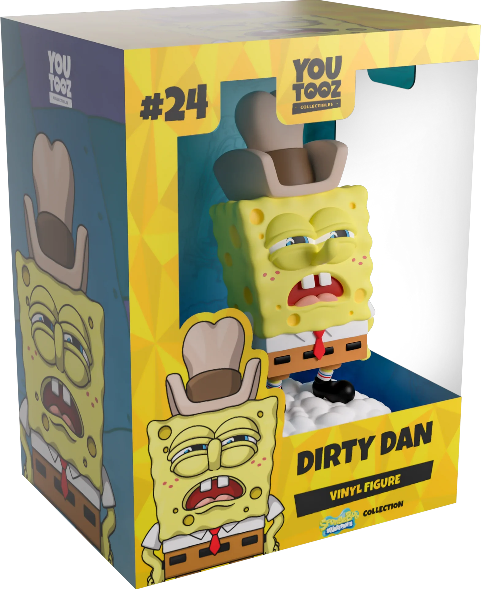 Dirty Dan s'est promené dans Youtooz, car il est temps qu'il obtienne son propre Youtooz ! Debout à 4,7 pouces de hauteur sur de la neige poudreuse, il se penche légèrement en arrière avec ses mains posées sur ses hanches et ses coudes en avant. Sur son visage, vous pouvez voir ses yeux plissés et son froncement de sourcils bouche bée, avec suspicion à travers ses yeux. Assis au sommet de sa tête se trouve un grand chapeau de cow-boy marron. La boîte de présentation à fenêtre a été illustrée pour mettre en valeur Dirty Dan et Patrick alors qu'ils se disputent dans la maison enneigée de Sandy. L'intérieur de la boîte a été conçu avec un fond bleu avec de nombreux motifs différents de Bob l'éponge sur tout l'intérieur de la boîte. La pochette de protection est conçue avec un motif mosaïque jaune. Cet objet de collection est livré dans une pochette extérieure protectrice mate en relief et un protecteur en plastique de taille personnalisée pour une protection maximale pendant l'expédition.