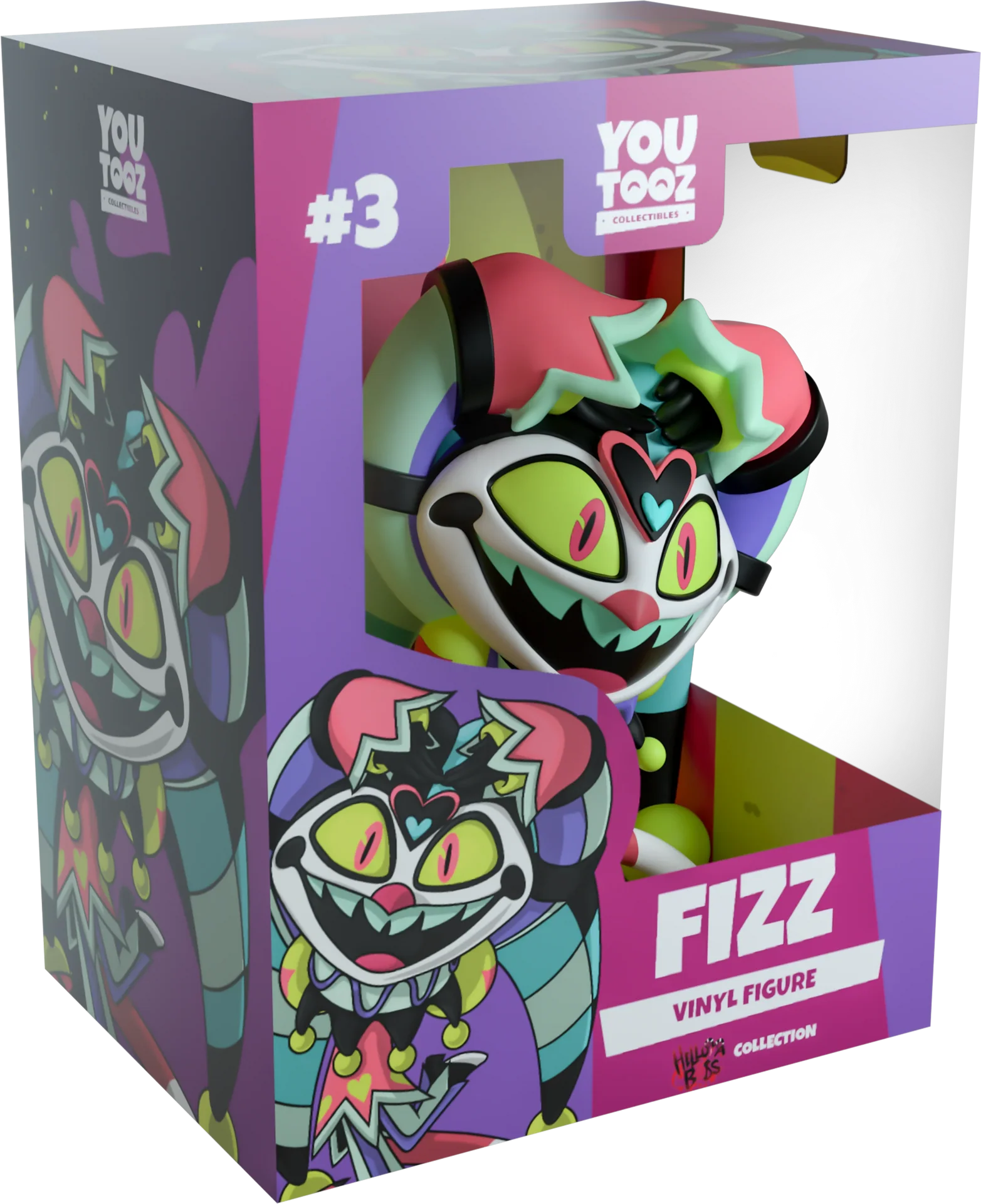 C'est l'heure d'une performance si bonne qu'elle pourrait très bien être notre dernière avec la grande entrée de Fizz sur Youtooz ! Avec les bras enroulés autour d'un visage au sourire maniaque qui a des yeux verts brillants et un cœur sur le front, deux épaisses pointes rayées de son chapeau de bouffon tombent avec une paire de balles reposant sur le sol alors qu'il mesure 4,8 pouces de hauteur avec un coup de pied dans la jambe. derrière lui. Vêtu d'une tenue de violets, roses, verts et jaunes vibrants, des cloches pendent aux points noirs de son col tandis que des cœurs tapissent la taille de son haut au-dessus d'un pantalon rayé et qu'une longue queue pointue s'enroule autour de son devant. L'extérieur de leur emballage présente une silhouette violet vif sur un fond sombre, tandis que l'intérieur les entoure de rayures roses et jaunes et rappelle un papier peint sale. La pochette de protection est ensuite ornée de rayures diagonales roses et noires et imprimée du logo « Helluva Boss » puisque leur silhouette est visible à travers la grande fenêtre d'affichage transparente située sur le devant. Cet objet de collection est livré dans une pochette extérieure de protection mate en relief et dans un protecteur en plastique de taille personnalisée pour une protection maximale pendant l'expédition.