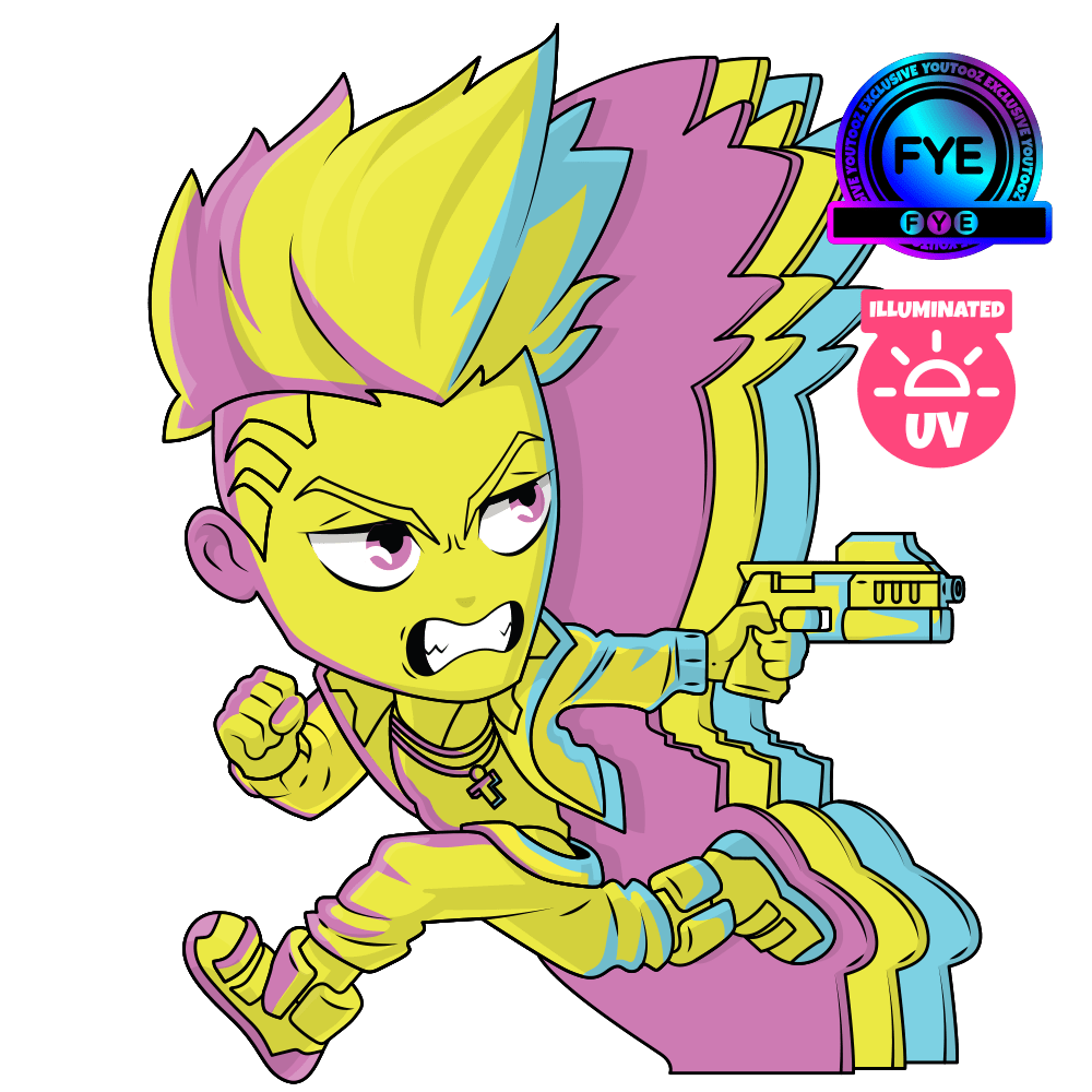 David est de retour, et il va si vite que son corps a déformé les couleurs. Sprintant vers l'avant à une vitesse de 4,5 pouces et brandissant un pistolet dans sa main gauche tendue, il laisse des couches d'ombres multicolores à sa place, alors que ses longs cheveux roses, jaunes et sarcelles volent vers le haut sur de longues mèches révélant une entaille striée. Un regard déterminé traverse son visage jaune fluo avec des dents dénudées et un froncement de sourcils concentré alors qu'il met tous ses efforts dans son objectif. Habillé parfaitement pour Night City, il porte une veste jaune vif avec des rayures bleues et roses, un col sauté et le logo Edgerunners sur le dos sur une tache bleu sarcelle. Ses colliers dorés et roses volent sur le côté en mouvement alors que des bretelles jaunes pendent sur un pantalon fluo qui est rehaussé de roses et de bleus dans les plis. La boîte de présentation à fenêtre a été illustrée dans la même palette de couleurs illuminées de jaune, bleu sarcelle et rose. Dans cet arc-en-ciel de couleurs, vous voyez David courir devant un bâtiment rose alors qu'un drone rose suit au-delà, maintenu en l'air par de la fumée et des flammes bleues. L'intérieur de la boîte montre des motifs cyberpunk jaunes entourant le logo Edgerunners, sur un fond bleu sarcelle. Tandis que la pochette de protection présente une scène de nuit avec David et Lucy prenant l'air de la nuit, flanquée de côtés en bleu sarcelle solide montrant la silhouette à l'intérieur.