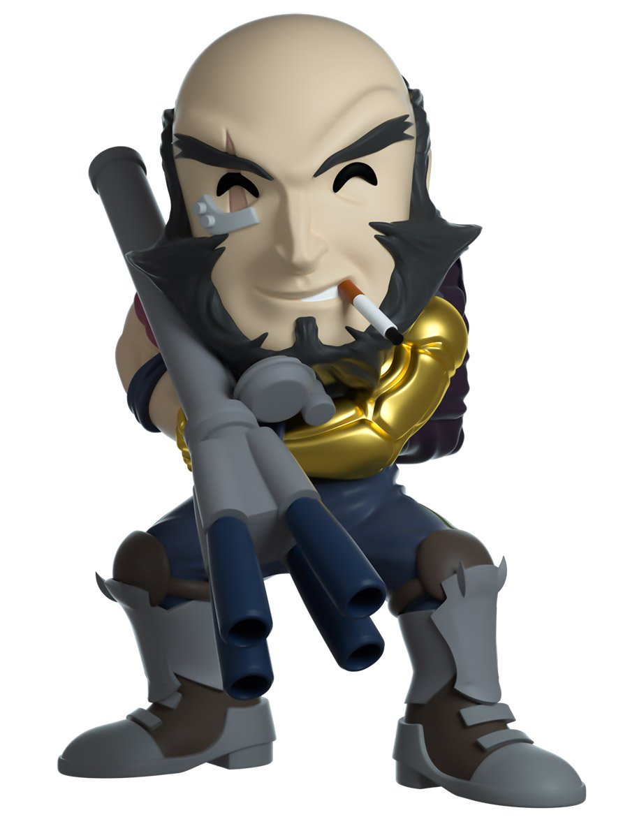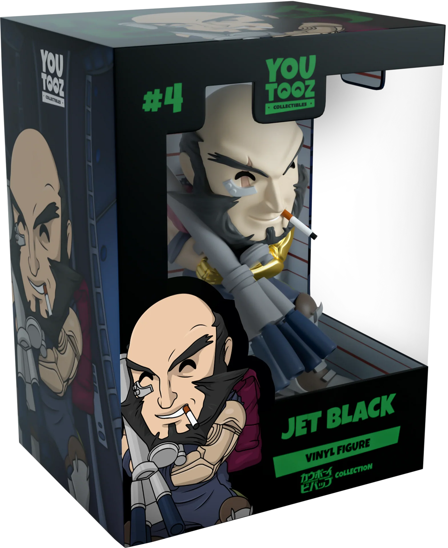 Je suis le chien noir, et quand je mords, je ne lâche pas prise. Jet Black est le capitaine du Bebop et le chef de son équipage. Il est connu sous le nom de chien noir ! Mesurant 12,7 cm de haut, Jet Black tient un lance-flammes à deux mains. Son bras robotique est sculpté pour montrer les rainures et les pièces individuelles. De sa bouche sort une cigarette, qui complète son sourire effronté. Il porte des bottes grises et marron. Son visage comprend la cicatrice sur son œil et la plaque métallique qui maintient ses blessures ensemble. Sa boîte à fenêtre à double paroi est illustrée pour montrer l'intérieur du Bebop lorsque l'alimentation a été coupée. Cet objet de collection est livré dans une pochette extérieure mate, gaufrée et protectrice inspirée de la séquence d'ouverture de Cowboy Bebop.