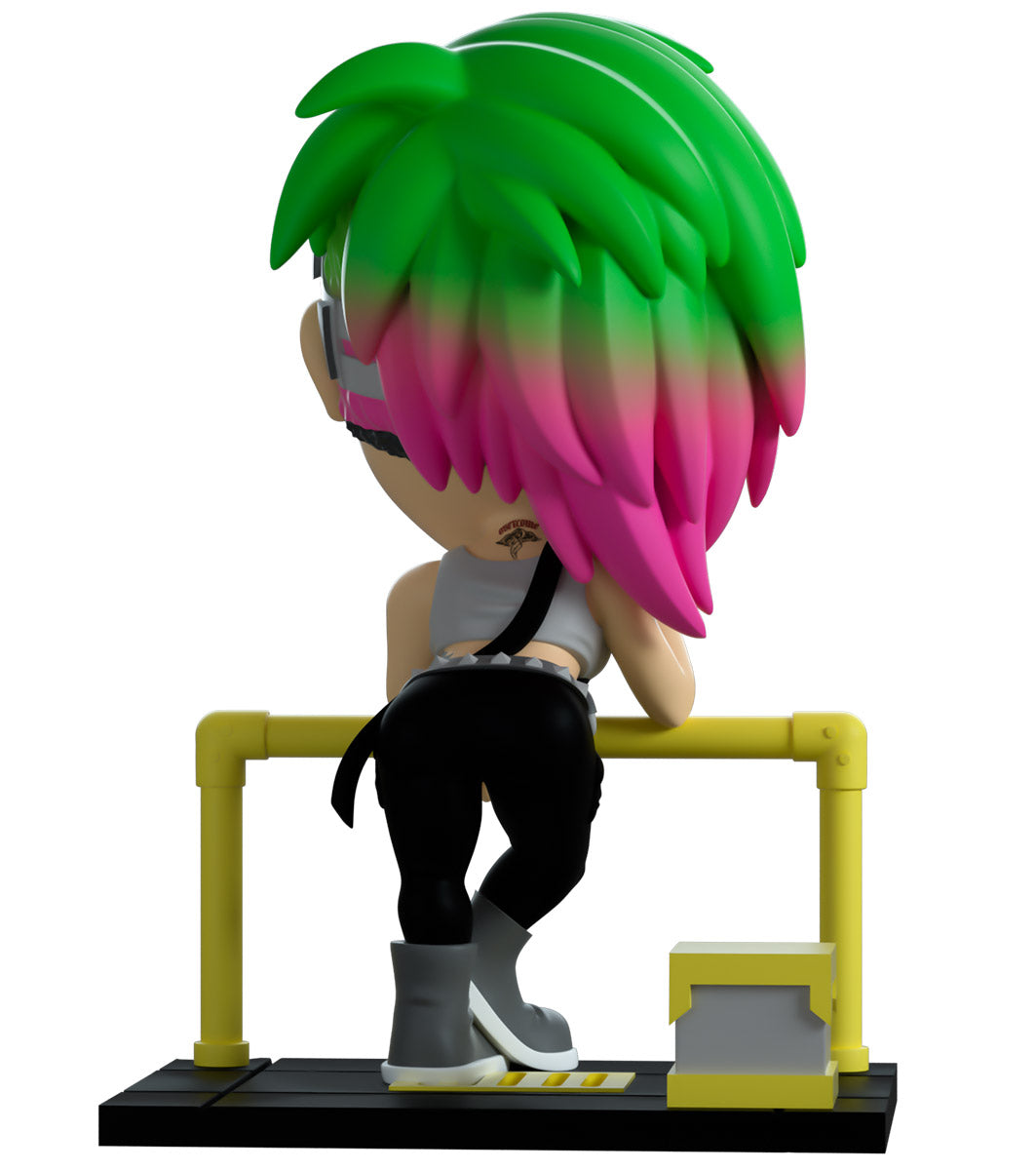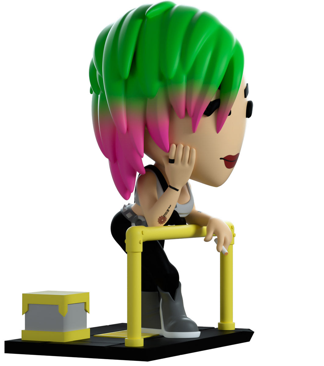 Attendez, rembobinez ça ! Maintenant, changez la fréquence... Pas de doute, c'est le premier Youtooz de Judy ! Prenant une pause après une dure journée de scan de danses cérébrales pour se détendre du mieux qu'elle peut, une cigarette allumée pend de ses doigts alors qu'elle se penche en avant sur une balustrade jaune vif pour regarder vers l'extérieur. Avec des vêtements cybernétiques gris posés sur le côté rasé de sa coupe en dessous, des cheveux verts mi-longs aux pointes roses se balayent sur le côté pour reposer près de la main qui soutient sa tête. Avec du rouge à lèvres rouge foncé et portant un simple débardeur gris qui met en valeur ses tatouages, sa salopette noire est maintenue par une sangle sur son épaule alors qu'elle appuie le bout d'une basket grise sur le sol. L'extérieur de son emballage montre Judy appuyée sur une balustrade jaune regardant une ville nocturne sombre. Alors que l'intérieur est d'un jaune vif et présente une silhouette de la ville nocturne avec le logo « Cyberpunk 2077 », cela se poursuit ensuite sur la pochette de protection où sa silhouette peut être vue à travers la grande fenêtre d'affichage transparente à l'avant. Cet objet de collection est livré dans une pochette extérieure de protection mate et gaufrée et un protecteur en plastique de taille personnalisée pour une protection maximale pendant l'expédition.