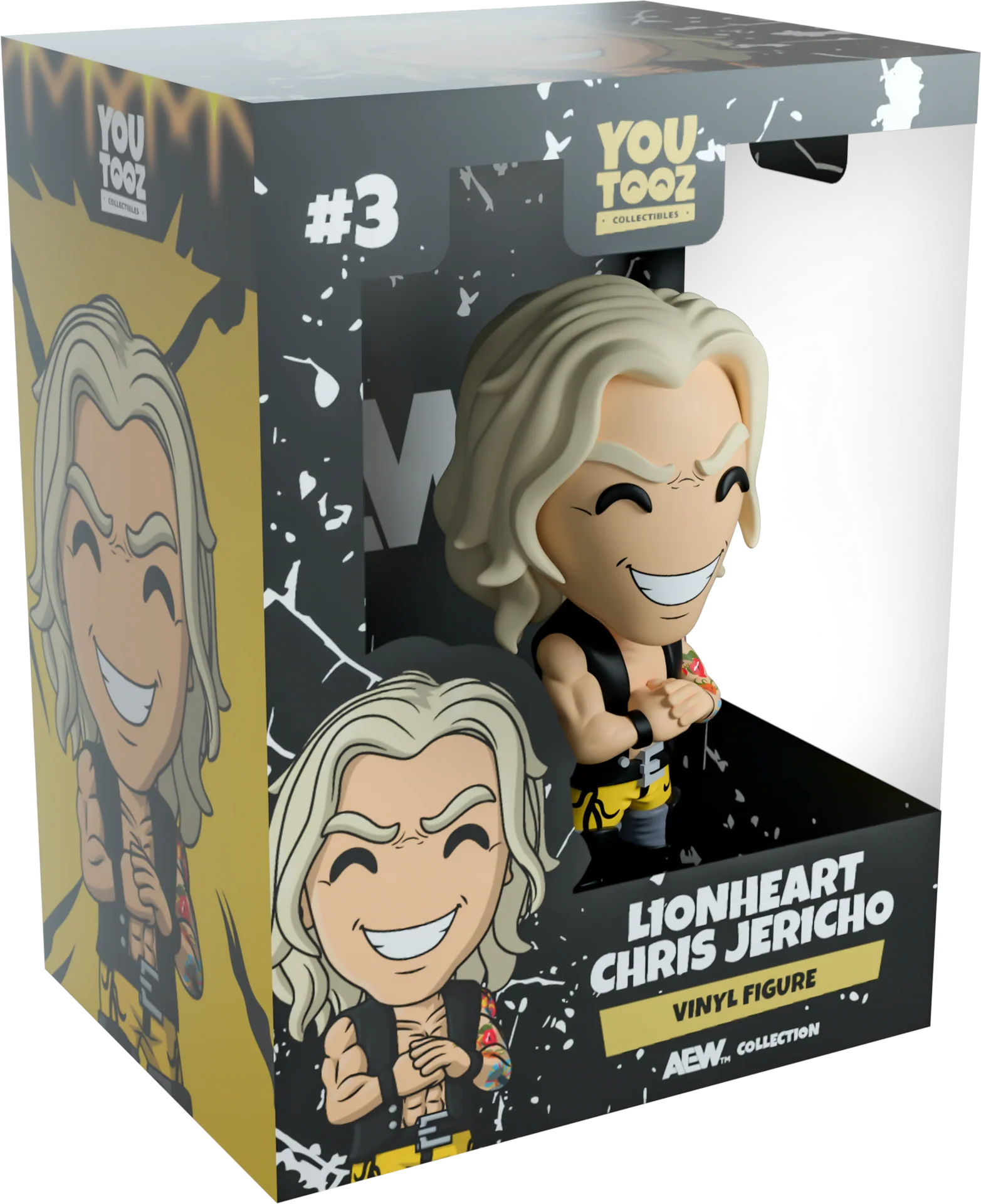 Quelqu'un a-t-il entendu ce rugissement ? Chris Jericho est là et tu ferais mieux de faire attention ! Mesurant 4,8 pouces de hauteur, cette icône de la lutte est prête pour le ring avec des bottes noires jusqu'aux genoux avec un pantalon jaune rentré et une épaisse ceinture noire enroulée autour de sa taille. Avec les bras musclés levés pour qu'il puisse se tordre les poings devant un pack de 6 ciselés et prêt à lutter, un gilet noir repose sur son torse pour s'assurer que ses bras ne sont pas cachés alors qu'un grand sourire malicieux s'étend sur son visage qui est encadré par de longues mèches de cheveux blonds. La vitrine vitrée montre Chris Jericho marchant sur un chemin flanqué de colonnes de flammes. Tandis que l'intérieur a été conçu avec un motif blanc sporadique moucheté sur un fond noir qui se poursuit sur la pochette de protection alors que sa silhouette est visible à travers la grande fenêtre transparente située à l'avant. Cet objet de collection a été conçu en collaboration avec le membre de la communauté @therealracckun et est livré dans une pochette extérieure de protection mate en relief et un protecteur en plastique de taille personnalisée pour une protection maximale pendant l'expédition.