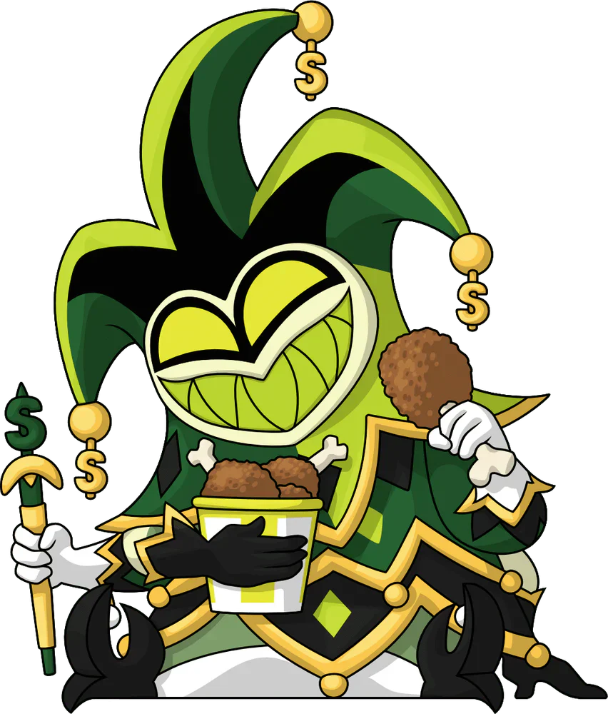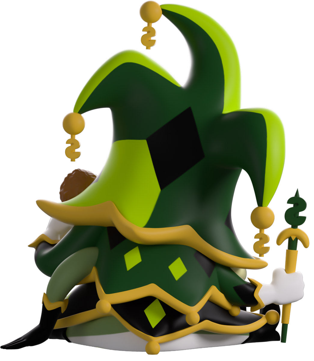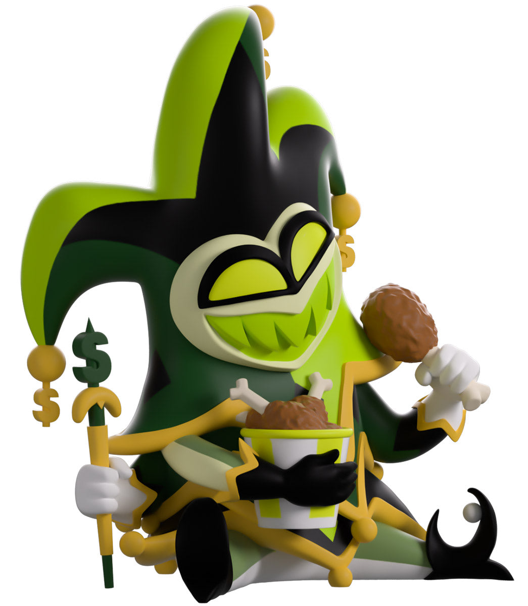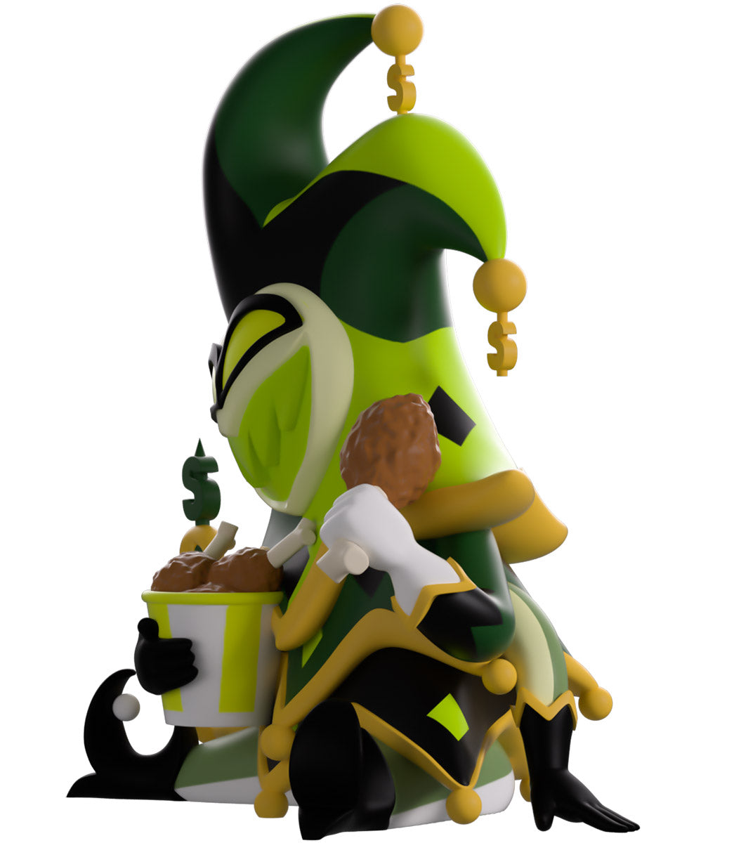 Venez vite ! Mammon est là pour montrer sa toute nouvelle attraction, ses débuts sur Youtooz ! Assis à 11,5 cm de hauteur avec ses jambes écartées, un sourire maladif aux dents vertes brille sur son visage en forme de cœur qui se trouve niché dans son grand chapeau de bouffon à 3 pointes avec une bordure dorée et des symboles de dollar suspendus à chaque pointe. Se préparant à dévorer l'os de viande dans sa main droite levée alors qu'il berce un seau de nourriture près de sa poitrine, l'une de ses mains tient un sceptre doré et vert à ses côtés alors qu'il porte une tenue superposée de robes vertes et noires pointues recouvertes d'un motif de diamants dorés. L'extérieur de son emballage voit leur silhouette verte et galbée sur un fond sombre, tandis que l'intérieur regarde une scène éblouissante qui brille de lumières vives. La pochette de protection est ensuite décorée de rayures diagonales vertes et jaunes et imprimée avec le logo « Helluva Boss » tandis que leur personnage est visible à travers la grande fenêtre transparente située à l'avant. Cet objet de collection est livré dans une pochette extérieure protectrice mate et gaufrée et un protecteur en plastique de taille personnalisée pour une protection maximale pendant l'expédition.