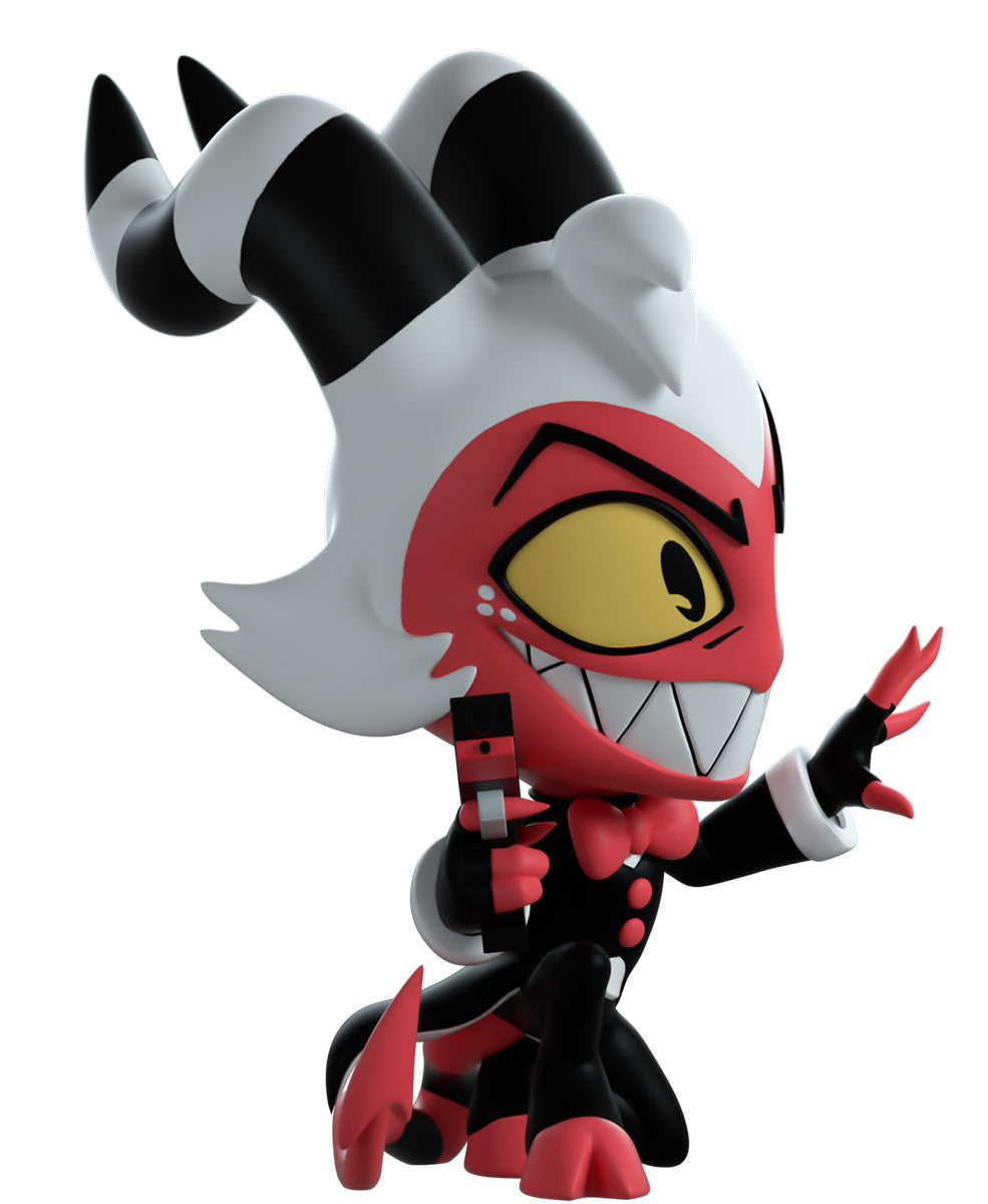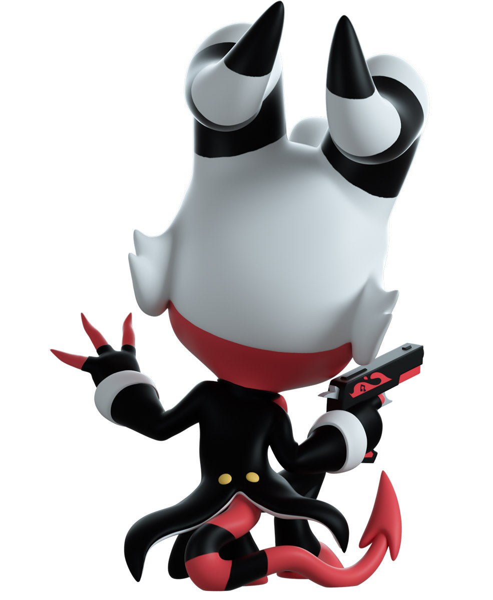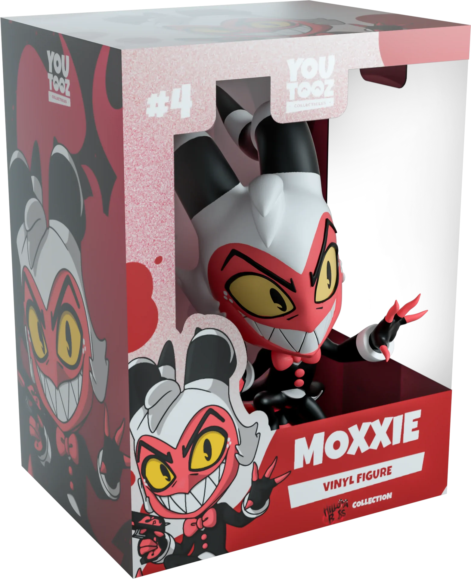 Un expert en armes, un assassin et surtout un mari adoré ? Que demander de plus !? Oh, attendez, un début sur Youtooz bien sûr ! Et Moxxie n’est pas du genre à décevoir ! Accroupi à 4,7 pouces de hauteur sur des pieds sabots et levant un pistolet orné dans sa main droite tandis que la gauche étend ses doigts fins, un sourire aux dents acérées s'étend sur son visage rouge alors que les sourcils inclinés reposent sur des yeux jaunes profonds. Avec des touffes de cheveux blancs sortant d'entre ses cornes rayées bouclées et de chaque côté de sa tête, il porte un nœud papillon rouge vif et un long manteau noir fluide qui se déploie aux extrémités tandis qu'une longue queue pointue serpente sur le côté. L'extérieur de leur emballage présente une silhouette rouge foncé sur un fond sombre, tandis que l'intérieur les entoure de rayures marron qui rappellent un papier peint sale. La pochette de protection est ensuite ornée de rayures diagonales noires et blanches et imprimée du logo « Helluva Boss » puisque leur silhouette est visible à travers la grande fenêtre d'affichage transparente située sur le devant. Cet objet de collection est livré dans une pochette extérieure de protection mate en relief et dans un protecteur en plastique de taille personnalisée pour une protection maximale pendant l'expédition.