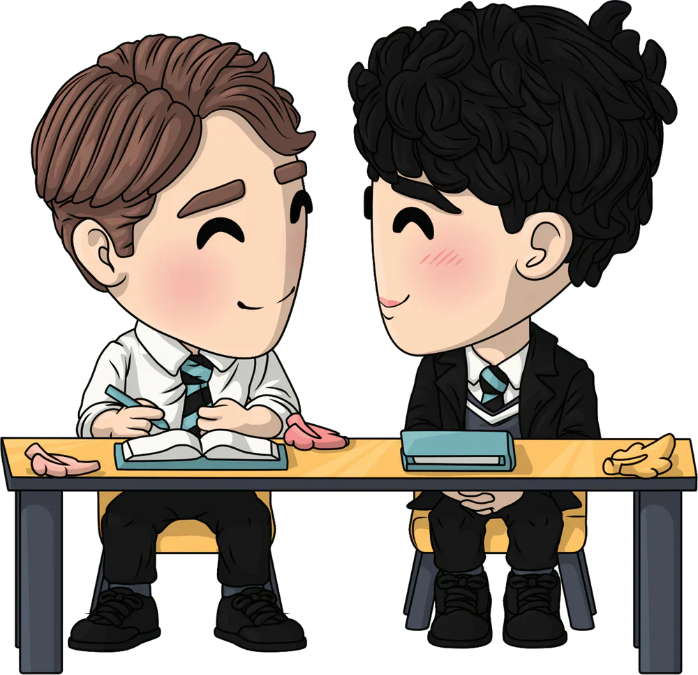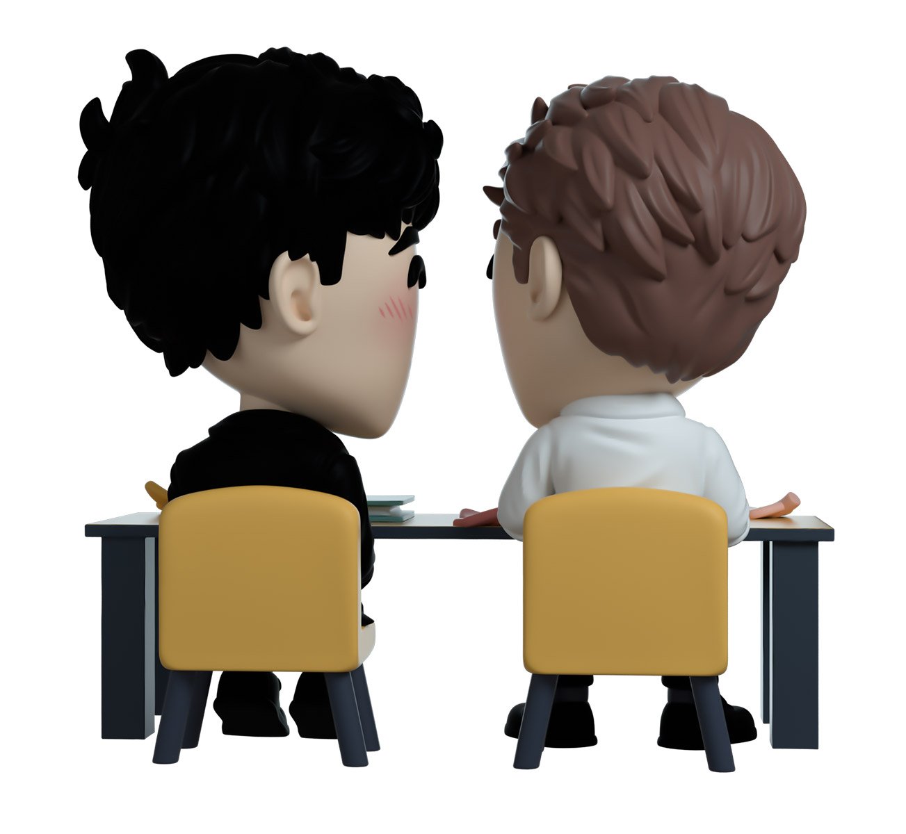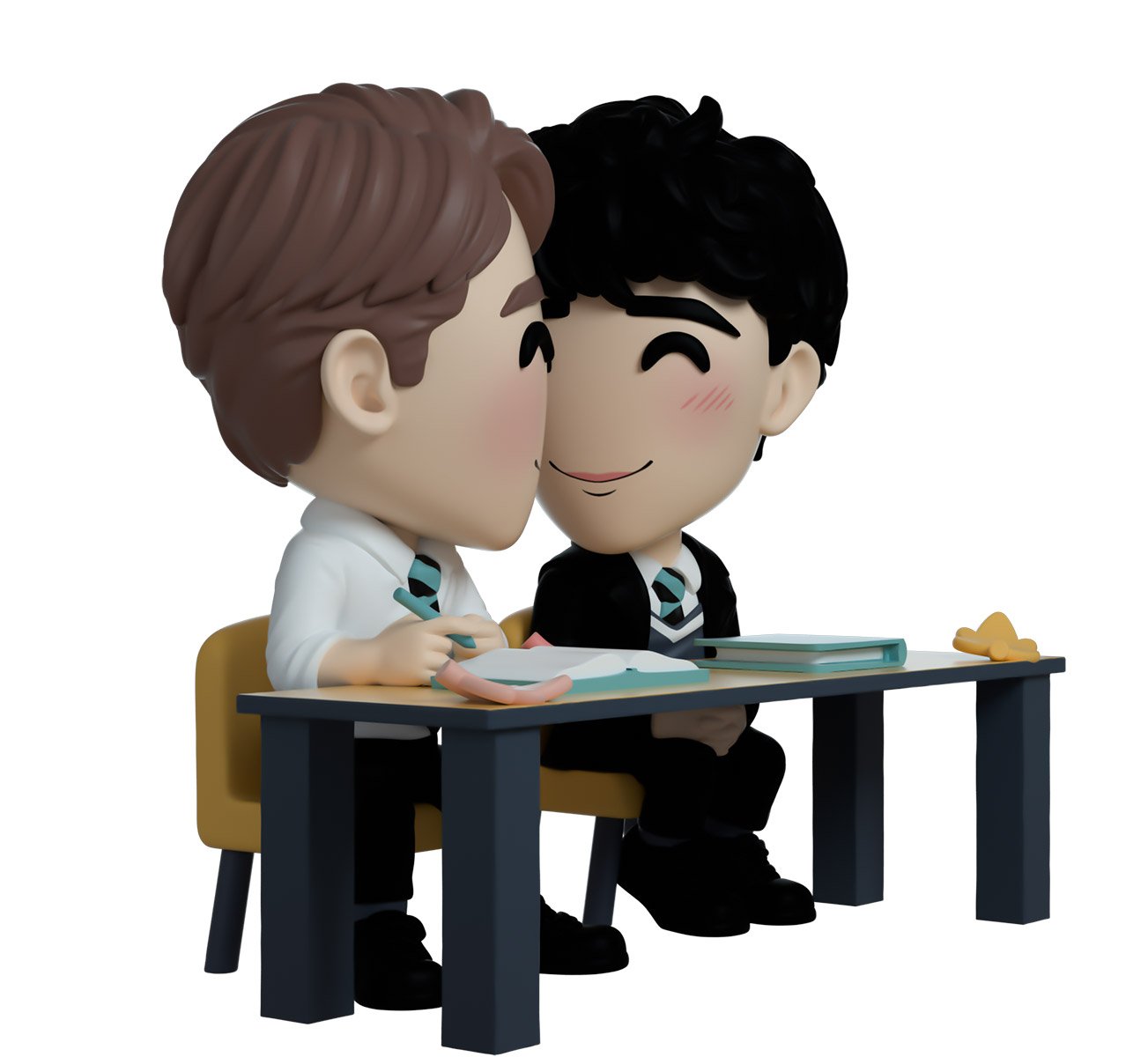 L'émission préférée des fans du monde entier "Heartstopper" est arrivée sur Youtooz ! Ce pack de 2 vinyles est livré avec Nick et Charlie lors de leur première scène de rencontre en classe. Nick est assis sur le siège de droite, vêtu d'une chemise boutonnée blanche et d'une cravate bleu sarcelle et noire avec un pantalon noir. Ses cheveux châtain clair sont séparés vers la gauche et il est posé regardant par-dessus son épaule gauche vers Charlie avec un doux sourire et une rougeur perceptible sur son visage. Charlie est assis sur le siège de gauche, vêtu d'une veste noire sur sa chemise blanche et d'une cravate bleu sarcelle et noire. Il est posé avec ses mains jointes sur ses genoux et il regarde Nick par-dessus son épaule droite. Ses cheveux noirs sont coiffés en petites boucles et il porte un sourire sur son visage avec du blush sur ses joues. L'extérieur de leur emballage à double paroi montre Nick et Charlie à l'intérieur de la salle de classe assis l'un à côté de l'autre et le terrain de rugby de l'autre côté. L'intérieur est un joli fendu mi bleu clair mi orange avec un motif de manches tombantes. Cet objet de collection est livré dans un manchon extérieur mat, gaufré et protecteur et un protecteur en plastique de taille personnalisée pour une protection maximale pendant l'expédition.