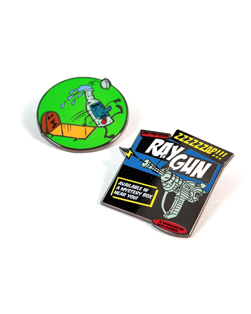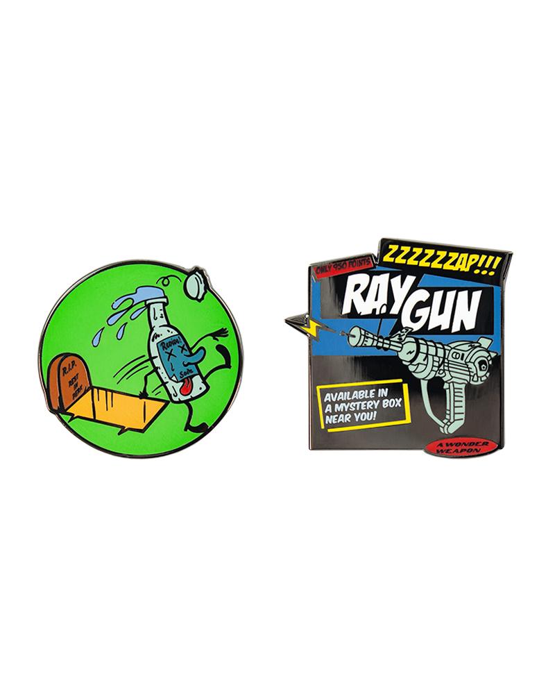 - Deux broches en métal émaillé dur de qualité supérieure avec une finition brillante avec les motifs de crête Revive Soda et Ray Gun sur une carte de support.