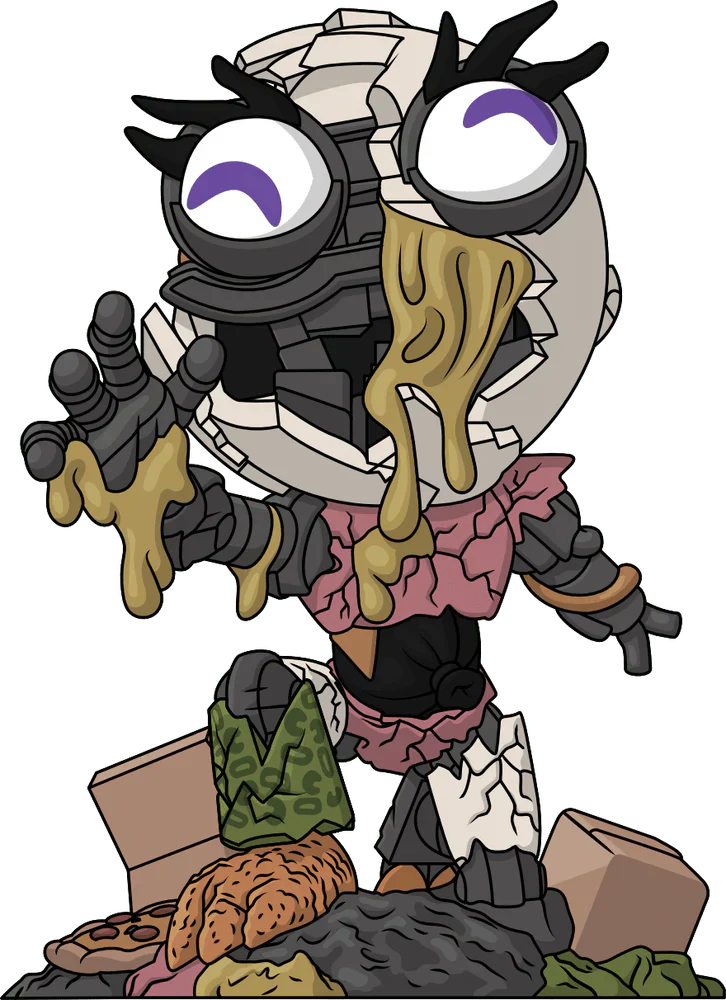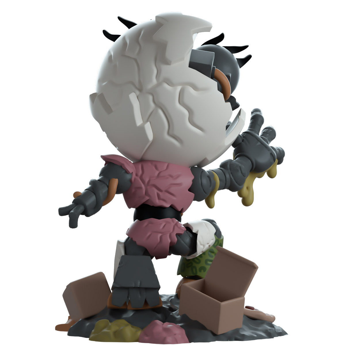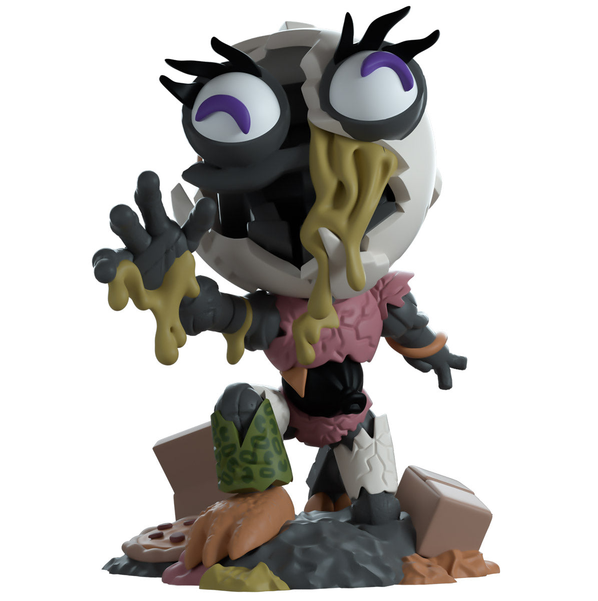 S'avançant avec une main métallique nue et tendue qui dégouline d'une mystérieuse substance jaune et mesurant 4,1 pouces de haut, la moitié de son visage brisé manque pour révéler un crâne en endosquelette froid qui suinte la même substance alors que ses yeux violets disjoints pointent dans des directions différentes. Il lui manque la majeure partie de son bras gauche et avec d'épaisses fissures sur ce qui reste d'un corps rose, vert et blanc, elle s'agenouille sur un tas de détritus avec un pied orange griffé dépassant vers l'extérieur. L'extérieur de son emballage voit Chica se diriger lentement vers vous dans un couloir de plus en plus petit. Tandis que l'intérieur est imprimé du logo néon « Frèche de sécurité » et recouvert d'un motif à carreaux bleu et noir qui se fraye un chemin sur la pochette de protection alors que sa silhouette peut être vue à travers la grande fenêtre d'affichage transparente située sur le devant. Cet objet de collection est livré dans une pochette extérieure de protection mate en relief et dans un protecteur en plastique de taille personnalisée pour une protection maximale pendant l'expédition.