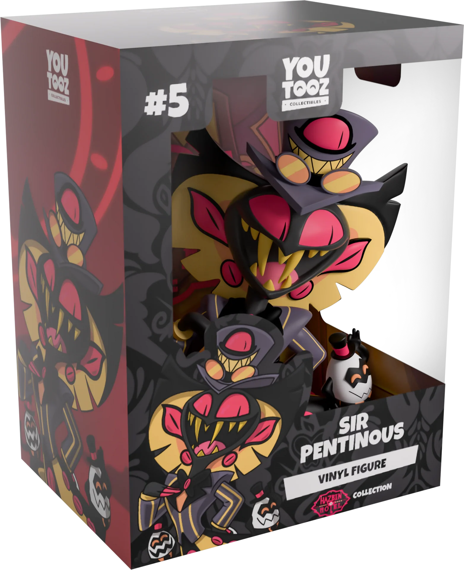 Sir Pentious se glisse dans Youtooz pour une première que seul un maître inventeur pourrait concevoir ! Mesurant 12,7 cm de haut, avec un énorme sourire aux dents acérées s'étendant sous une paire d'yeux rose foncé et portant un haut-de-forme à bord pointu, des lunettes de protection et son propre sourire maléfique, il porte un blazer gris et jaune alors qu'il tient une main devant sa poitrine. Avec une capuche noire et jaune brillante couverte de marques roses pour ressembler à des yeux s'étendant derrière sa tête, sa queue épaisse s'enroule autour de lui pour le maintenir soutenu alors qu'une paire d'Egg Boi se tient à ses côtés. L'extérieur de son emballage montre un énorme pentagramme dans un ciel rouge foncé, tandis que l'intérieur présente un escalier doré s'élevant au-dessus de murs écaillés. La pochette de protection montre ensuite la silhouette de la ville avec une lumière rouge foncé qui brille depuis les bâtiments tandis que sa silhouette peut être vue à travers la grande fenêtre transparente à l'avant de l'emballage. Cet objet de collection est livré dans une pochette extérieure mate et gaufrée de protection et un protecteur en plastique de taille personnalisée pour une protection maximale pendant l'expédition.