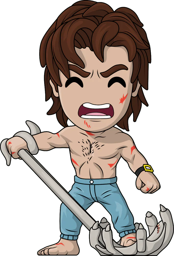 C'est bon Steve, Dustin t'aime toujours. Le beau batteur de cœur, Steve Harrington rejoint le reste de l'équipe de Stranger Things ! Debout à 5,1 pouces, Steve est pieds nus et torse nu, avec des poils de poitrine très visibles, couverts d'éclaboussures de sang rouge autour de son visage et de son corps. Ses cheveux bruns volumineux sont un peu ébouriffés alors qu'il est occupé à essayer de combattre le monstre volant gris. Il utilise sa main droite pour tirer la queue de la créature tout en utilisant son pied gauche pour la clouer au sol. Sur son poignet gauche, vous pouvez voir sa montre en or avec un bracelet noir attaché sur lui et son pantalon est un jean bleu clair. L'extérieur de son emballage à double paroi montre Steve à l'intérieur de l'Upside Down avec des teintes de violet foncé et de bleu autour de lui à l'intérieur d'une forêt. Il est au milieu d'un combat où il tient la queue d'une créature grise tandis que les autres monstres semblent voler vers lui. L'intérieur est un fond noir avec ce qui semble être un reflet visqueux.