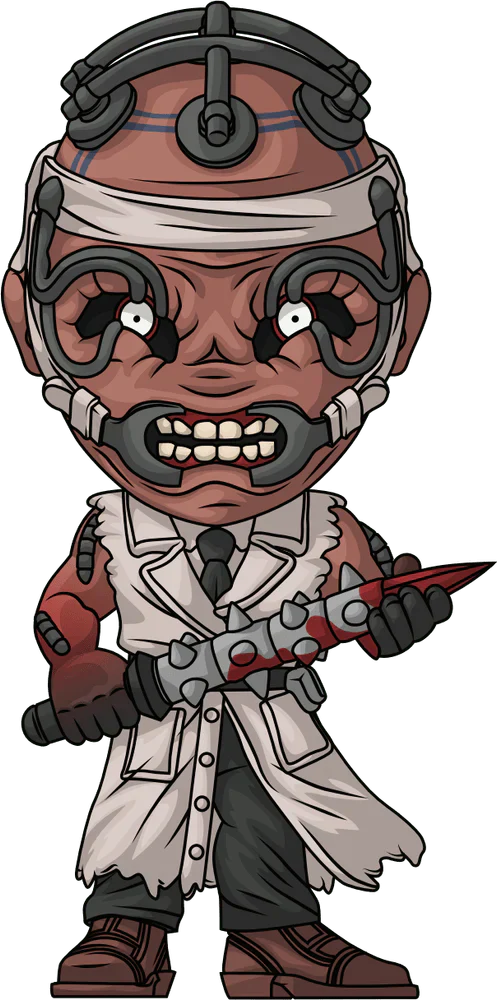 Prêt pour l'opération ? Eh bien, le Docteur est là et il est prêt à couper même si vous ne l'êtes pas ! Debout, préparé et prêt à 11,7 cm de hauteur, le Docteur tient sa pointe sanglante de manière menaçante dans ses deux mains alors qu'il est vêtu d'un pantalon noir, d'une veste marron et d'une longue blouse blanche en lambeaux déchirée aux manches et cintrée à la taille avec une ceinture noire. Avec son visage noueux déformé en un grognement involontaire, l'appareil métallique attaché à sa tête lui tire la bouche et les yeux ouverts. La boîte de présentation à fenêtre a été conçue pour présenter le Docteur derrière l'ouverture d'une porte pour vous accueillir dans son cabinet. Alors que l'intérieur est une forêt à silhouette noire avec une brume rouge et bleue brillante et le logo blanc « Dead by Daylight » à l'arrière, ce motif sinistre se poursuit ensuite sur la pochette de protection avec des arbres sombres qui l'entourent complètement tandis que leur silhouette peut être vue à travers la grande fenêtre transparente à l'avant. Cet objet de collection est livré dans une pochette extérieure protectrice mate et gaufrée et un protecteur en plastique de taille personnalisée pour une protection maximale pendant l'expédition.