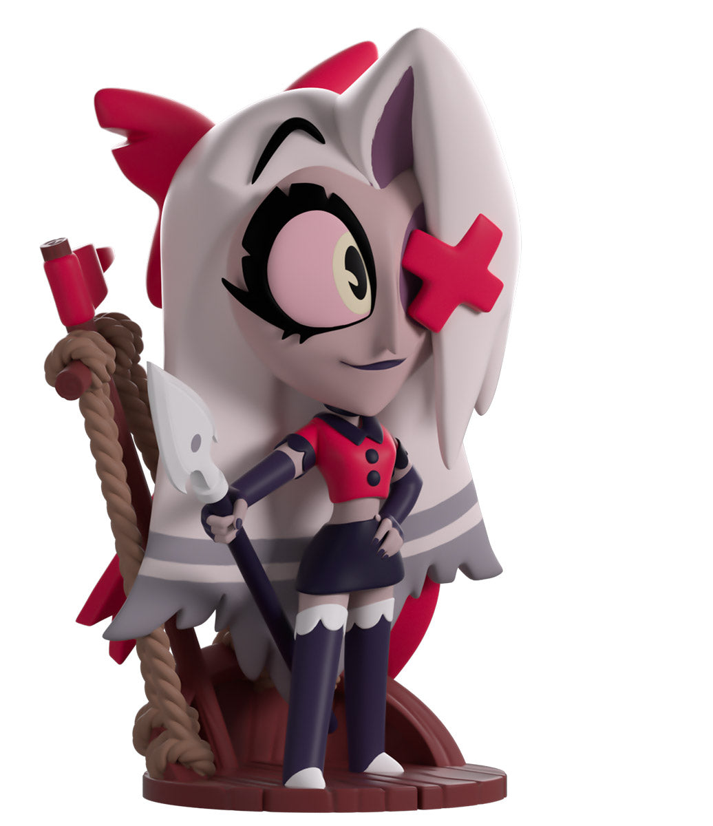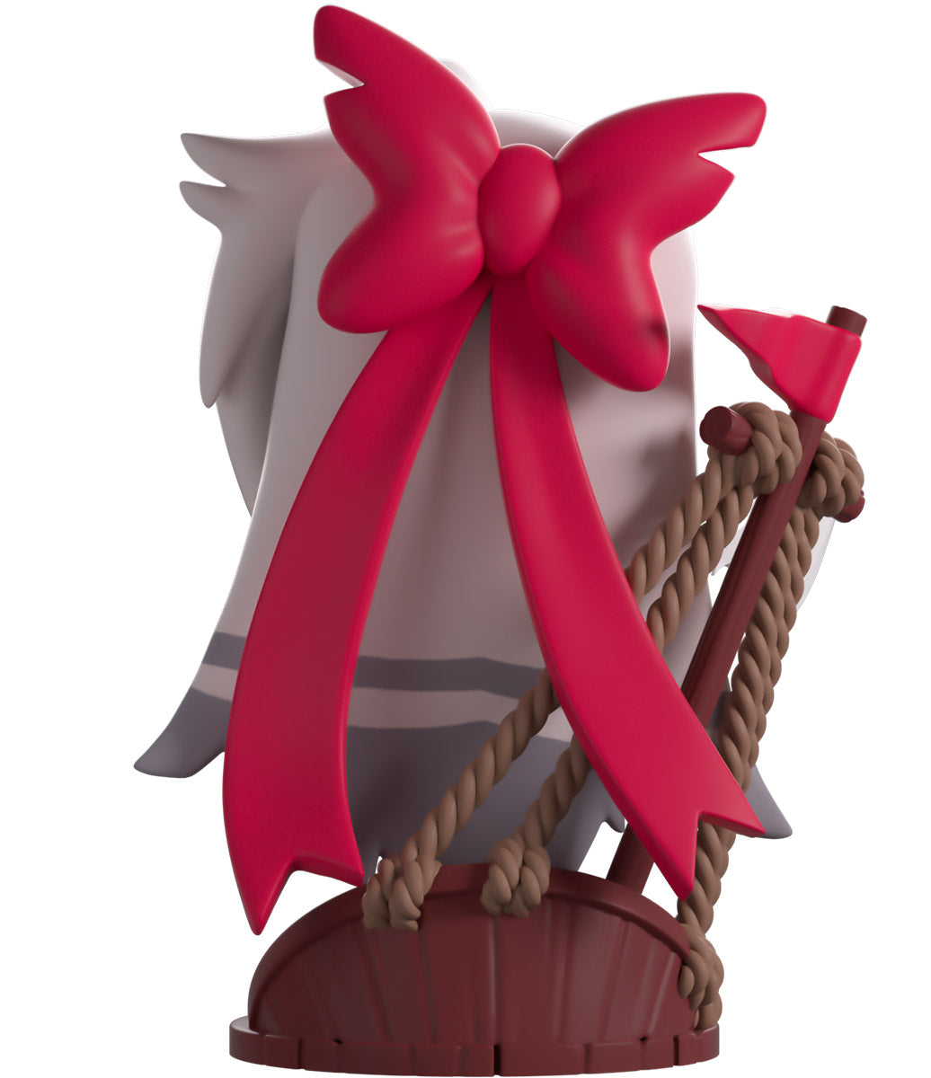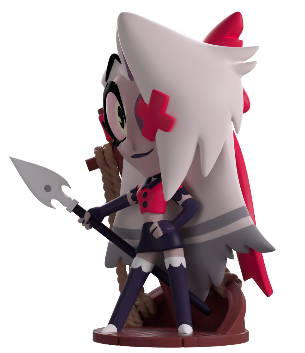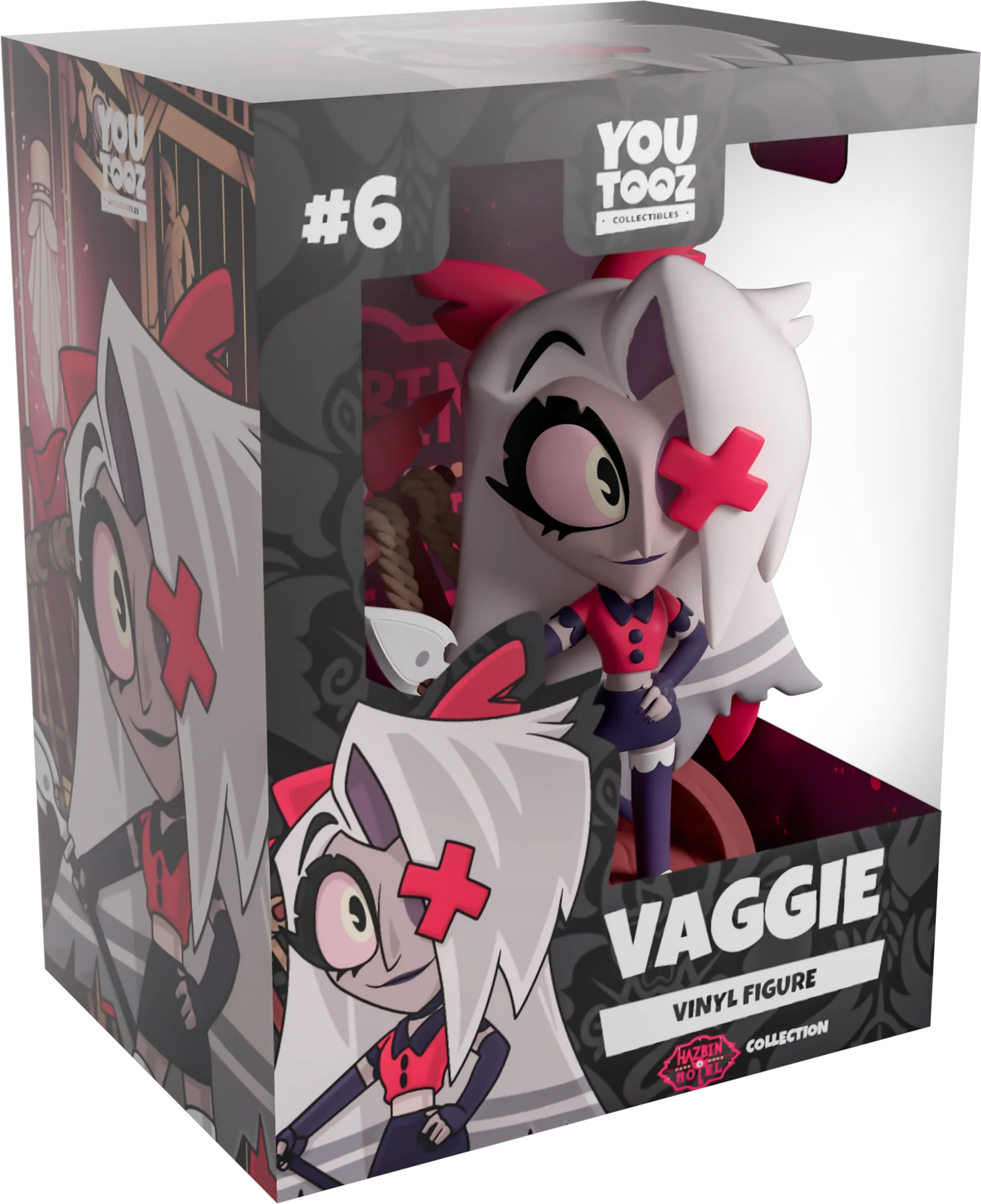 Vaggie a suivi Charlie directement sur Youtooz pour lui apporter tout le soutien possible pour ses débuts ! Debout à 14 cm de hauteur devant le nid-de-pie d'un navire dont la voile rouge flotte du haut de son mât, elle tient une longue lance dans sa main droite tandis que la gauche repose sur sa hanche et qu'une longue frange tombe sur la moitié de son visage. Avec un sourire narquois sur son visage tandis qu'un énorme œil regarde vers l'extérieur et que l'autre est marqué d'un « X » rouge, elle porte un énorme nœud à l'arrière de la tête, un haut court et à col, une jupe courte et des manchettes et des jambières. L'extérieur de son emballage rappelle les murs de l'hôtel avec de l'or orné sur un rouge profond, tandis que l'intérieur voit le nid-de-pie d'un navire devant un ciel violet. La pochette de protection dévoile ensuite la silhouette de la ville avec une lumière rouge foncé qui brille depuis les bâtiments tandis que sa silhouette peut être vue à travers la grande fenêtre transparente à l'avant de l'emballage. Cet objet de collection est livré dans une pochette extérieure protectrice mate et gaufrée et un protecteur en plastique de taille personnalisée pour une protection maximale pendant l'expédition.